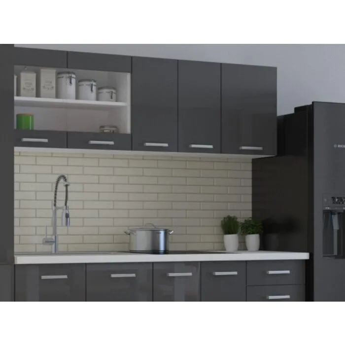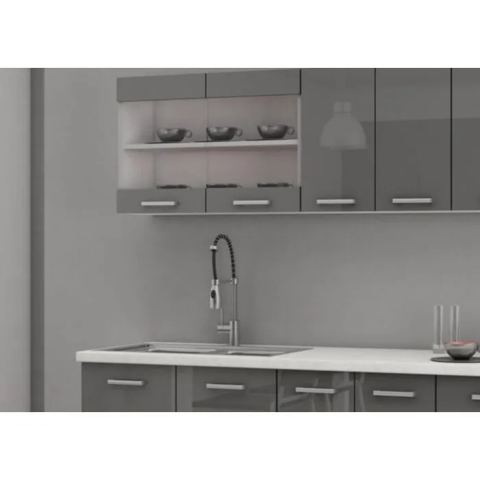 Kuhinjski blok SONJA 240 cm je dobavljiva v belo sivi kombinaciji. Korpusi so iz laminirane plošče debeline 18 mm. Vrata steklene viseče omarice so iz kaljenega stekla. Kuhinja ima ABS rob. Ročaji so iz pvc-ja.