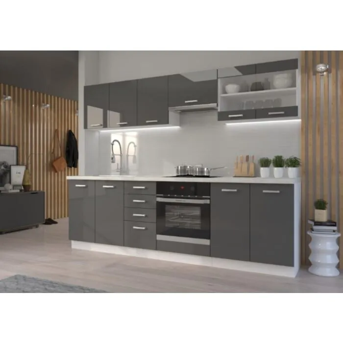 Kuhinjski blok SONJA 260 cm z vgradnimi aparati je izdelana iz oplemenitenih ivernih plošč debeline 16 mm in ABS robovi, oblečena v dekor, kateri jo ščiti pred vlago in ima visoko odpornost na praske. Dobavljiva je v sivi visoki sijaj/beli visoki sijaj barvi. Debelina delovnega pulta je 28 mm. Kuhinjski blok SONJA z vgradnimi aparati je modernega videza, zato bo popestrila vsako kuhinjo.