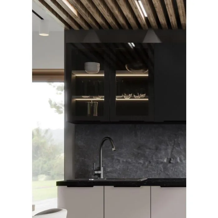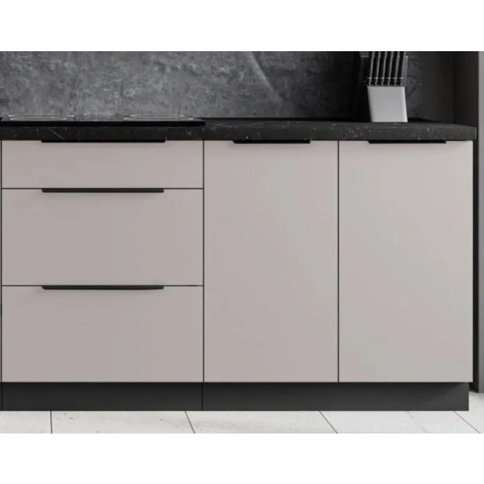 Kuhinjski blok STAŠA 260 cm je kuhinja v kombinaciji črne mat in kašmir barve. Kuhinja je izdelana iz oplemenitenih ivernih plošč debeline 16 mm in je oblečena v dekor, kateri jo ščiti pred vlago. Prav tako imajo plošče visoko odpornost na praske. Debelina delovnega pulta je 38 mm. Ročaji so iz aluminija. Kuhinjski blok je modernega/klasičnega videza zato se bo prilegal v vsako kuhinjo.