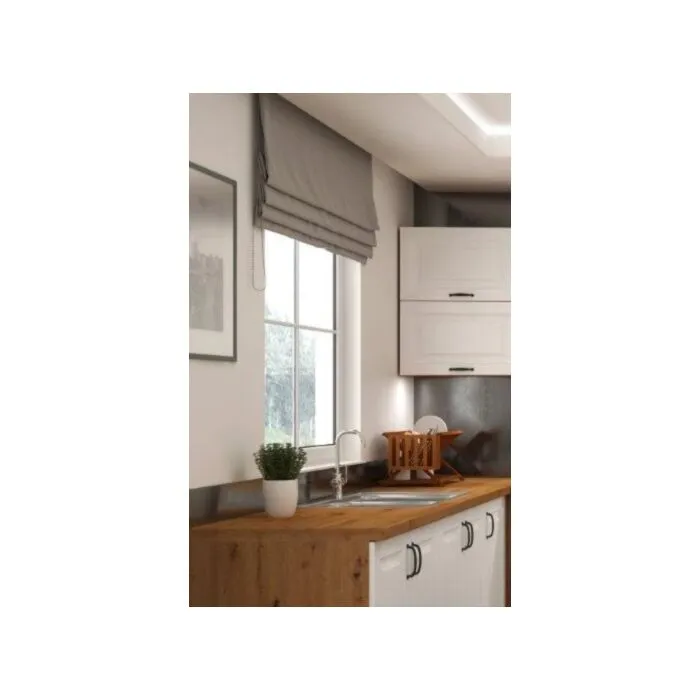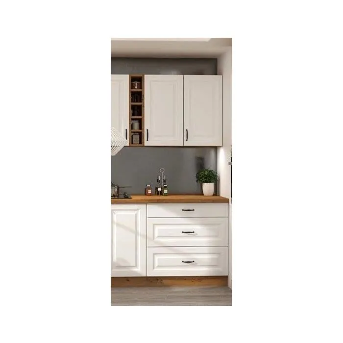 Kuhinjski blok STIL 1- 265 x 300 x 180 cm je dobavljiva v beli barvi. Debelina delovnega pulta je 38 mm. Fronte kuhinje imajo MDF rob. Kuhinja je izdelana iz oplemenitenih ivernih plošč debeline 16 mm in je oblečena v dekor, kateri jo ščiti pred vlago. Kuhinjski blok je modernega/klasičnega videza zato se bo prilegal v vsako kuhinjo.
