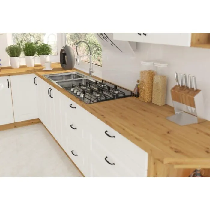 Kuhinjski blok STIL 310 x 340 cm je dobavljiva v beli barvi. Debelina delovnega pulta je 38 mm. Fronte kuhinje imajo MDF rob. Kuhinja je izdelana iz oplemenitenih ivernih plošč debeline 16 mm in je oblečena v dekor, kateri jo ščiti pred vlago. Kuhinjski blok je modernega/klasičnega videza zato se bo prilegal v vsako kuhinjo.