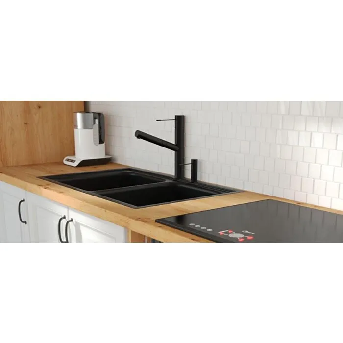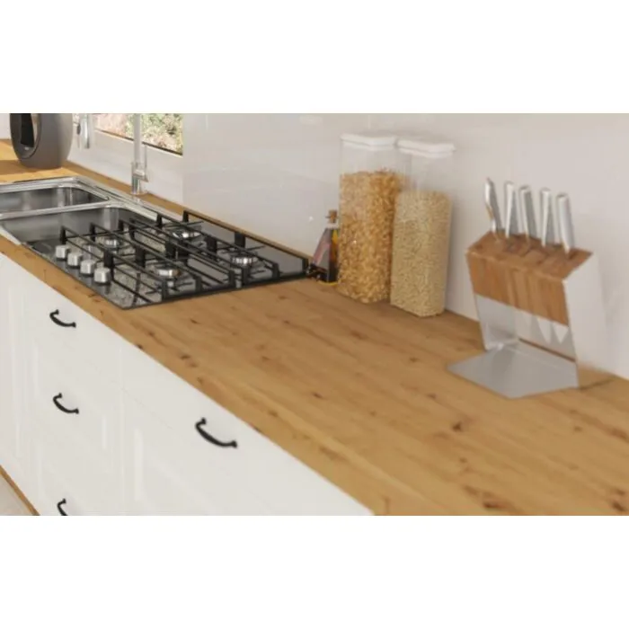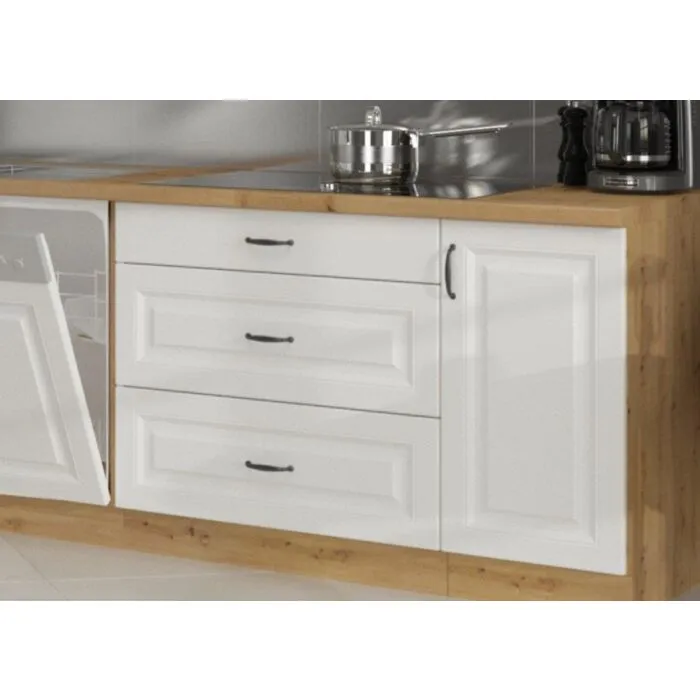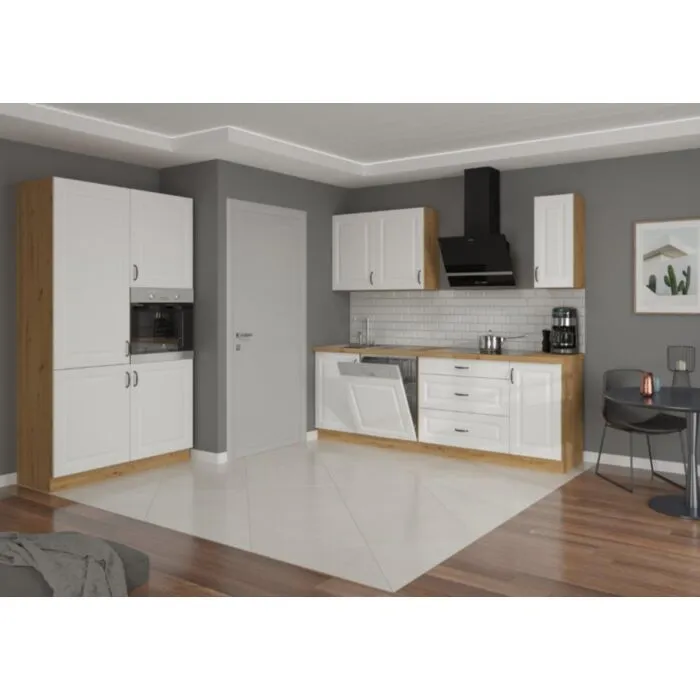 Kuhinja STIL je dolžine 350 cm. Kuhinja je narejena iz kvalitetnega iverala debeline 16 mm. Delovni pult je laminiran v hrast barvi debeline 38 mm. Kuhinja ima mehko zapiranje predalov in vrat. Fronte kuhinje so obelane z melaminom in imajo ABS rob. Možnost naročanja dodatnih elementov
