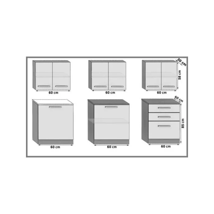 V ceno je vključen le leseni del kuhinje. Možnost je naročiti sistem za mehko zapiranje vrat. Predali pa nimajo možnosti mehkega zapiranja. Stranice kuhinjskih elementov so v mat barvi. Debelina kuhinjskega pulta je 3cm. Globina spodnje omarice 45 cm.