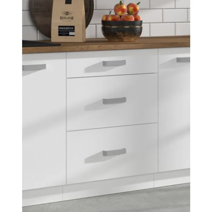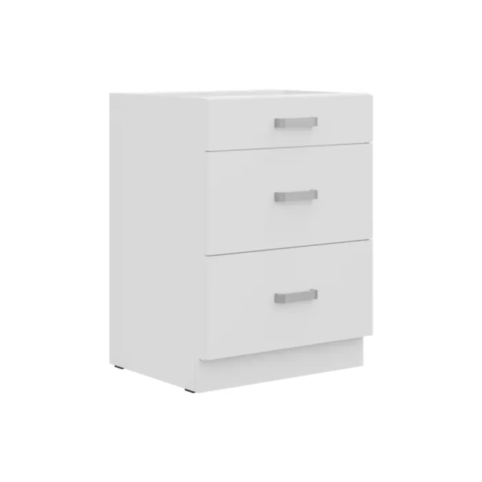 Kuhinjski element STELLA 60D 3S je sestavljen iz fronte iz MDF plošče, debeline 16 mm, robovi so iz ABS 1,7 mm. Korpus je narejen iz laminirane plošče, debeline 16 mm, robovi so iz melamina. Na voljo je v beli barvi korpusa in front ter sivi barvi ročajev. Kuhinjski elementi imajo sistem mehkega zapiranja.