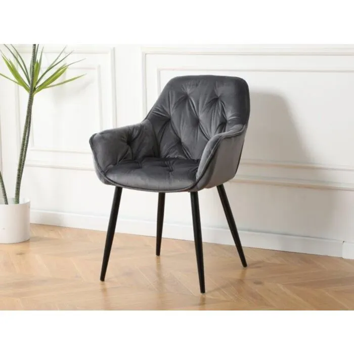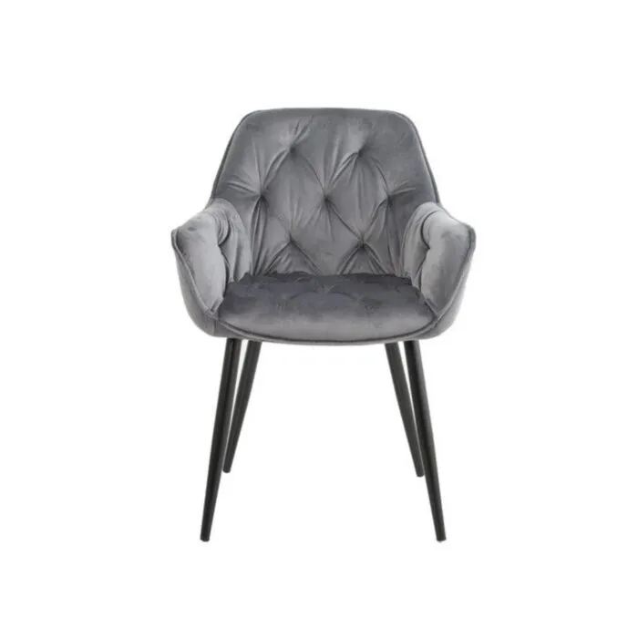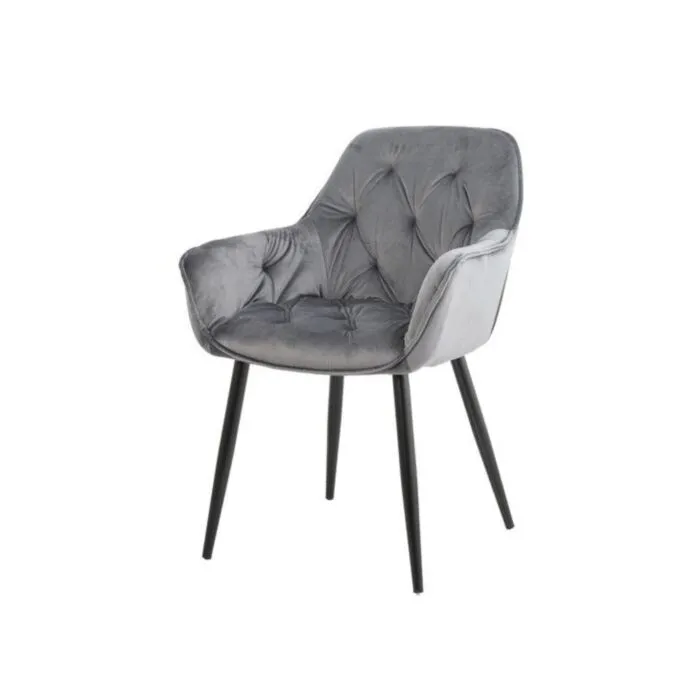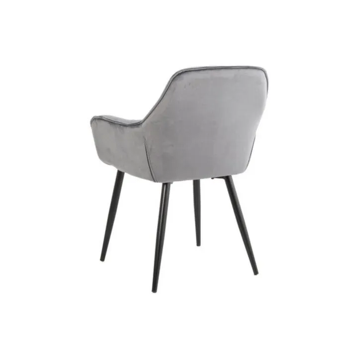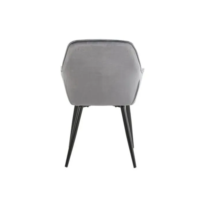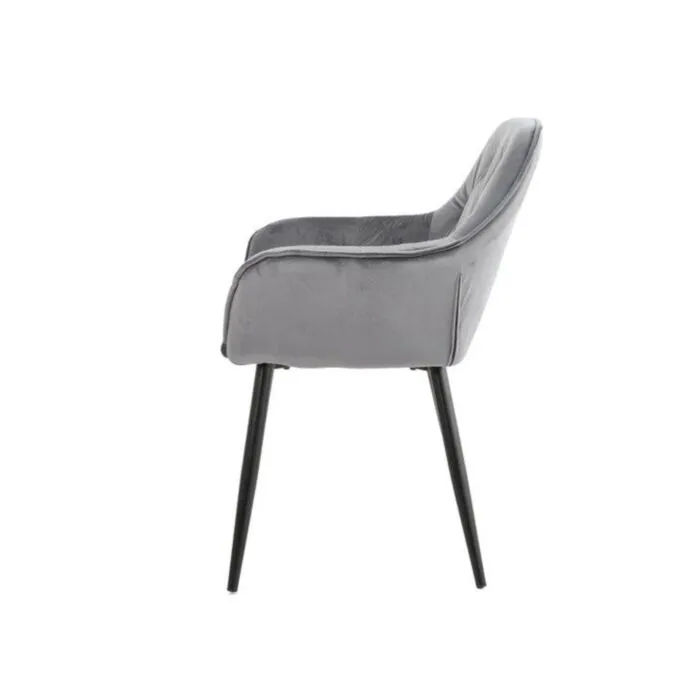 Kuhinjski stol ADO velvet siva je izdelan iz visoko kakovostne tkanine velvet. Močna stabilna kovinska konstrukcija mu zagotavlja vzdržljivost ter stabilnost. Sedež in naslon sta oblazinjena z velvet tkanino, nameščena na močne črne mat kovinske noge, ki so prašno barvane z debelino profila 1,2 mm. Prav tako je naslon v notranjosti okrašen z gostimi prešiti vzorci, ki zagotavljajo moderen izgled. Dodatno udobnost mu zagotavljata naslona za roke, ki sta prav tako prešita z vzorci in ustvarita eleganten izgled.