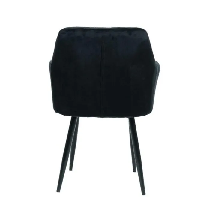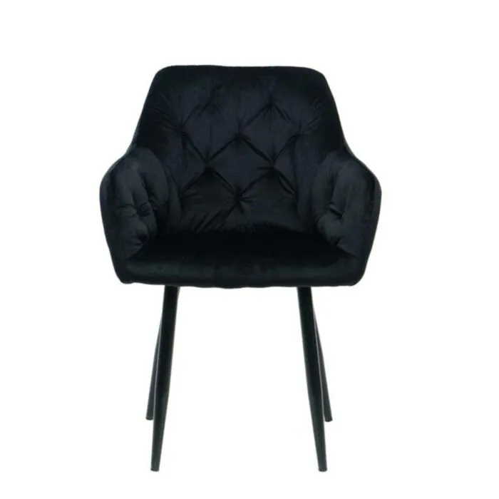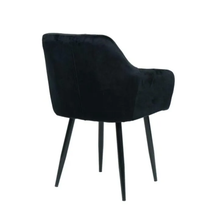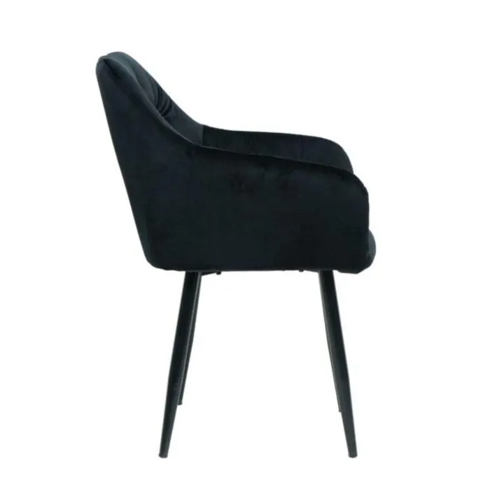 Kuhinjski stol ČILI VELVET črna je izdelan iz visoko kakovostne tkanine velvet. Močna stabilna kovinska konstrukcija mu zagotavlja vzdržljivost ter stabilnost. Sedež in naslon sta oblazinjena s velvet tkanino, nameščena na močne črne mat kovinske noge, ki so prašno barvane s debelino profila 1,2 mm. Prav tako je naslon v notranjosti okrašen z gostimi prešiti vzorci, ki zagotavljajo moderen izgled. Dodatno udobnost mu zagotavljata naslona za roke, ki sta prav tako prešita z vzorci in ustvarita eleganten izgled.