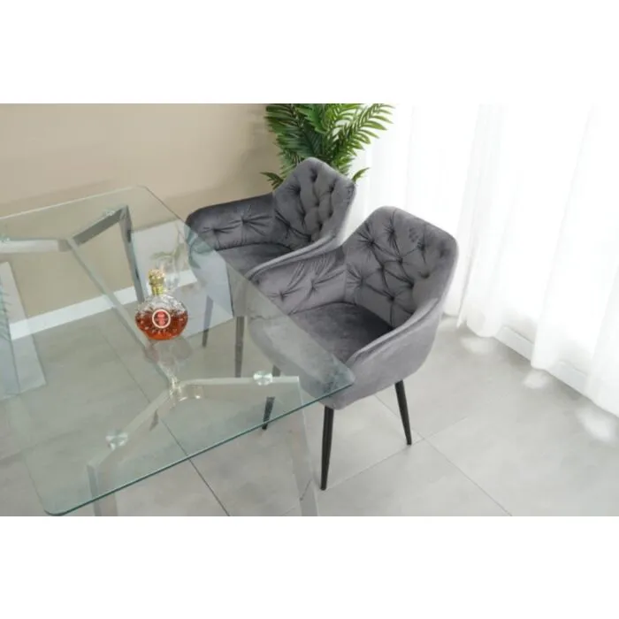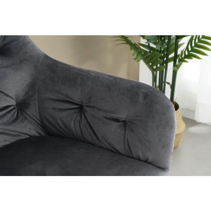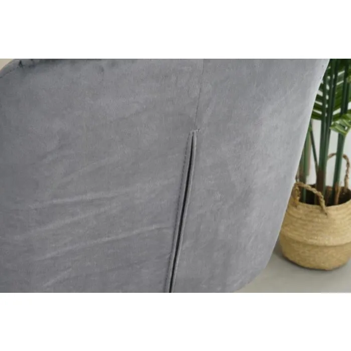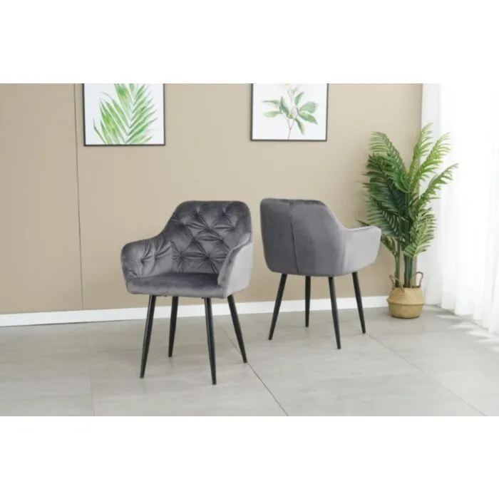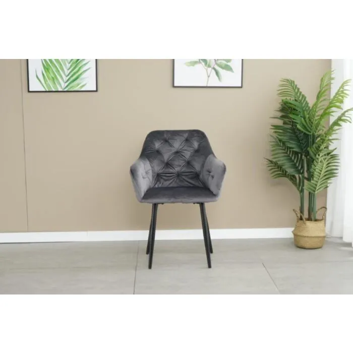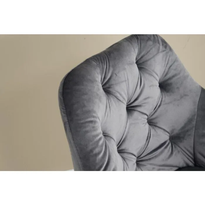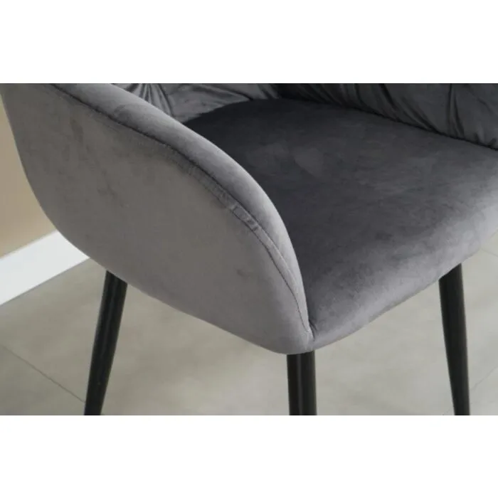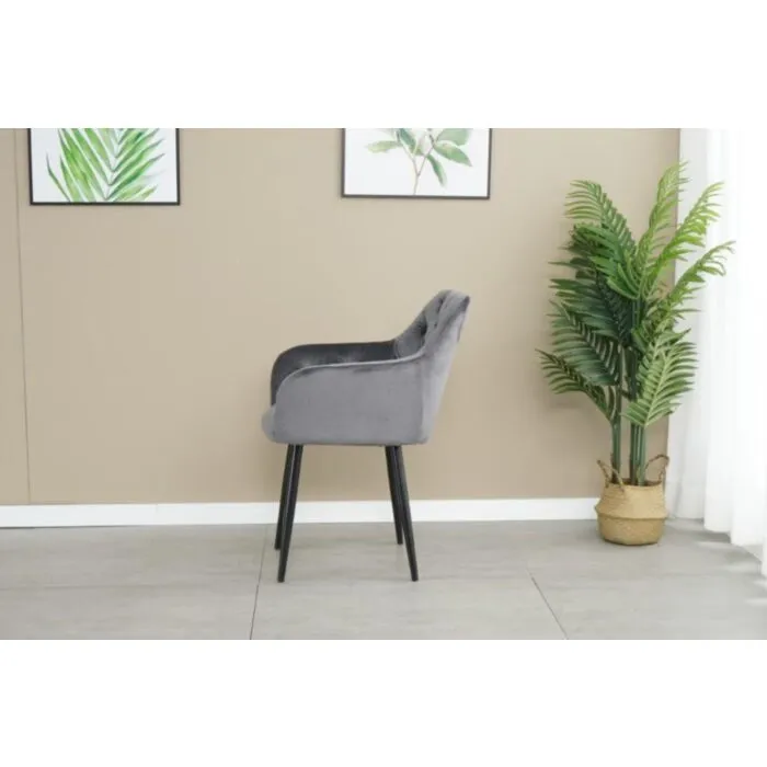 Kuhinjski stol ČILI VELVET siva je izdelan iz visoko kakovostne tkanine velvet. Močna stabilna kovinska konstrukcija mu zagotavlja vzdržljivost ter stabilnost. Sedež in naslon sta oblazinjena s velvet tkanino, nameščena na močne črne mat kovinske noge, ki so prašno barvane s debelino profila 1,2 mm. Prav tako je naslon v notranjosti okrašen z gostimi prešiti vzorci, ki zagotavljajo moderen izgled. Dodatno udobnost mu zagotavljata naslona za roke, ki sta prav tako prešita z vzorci in ustvarita eleganten izgled.