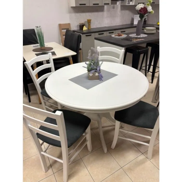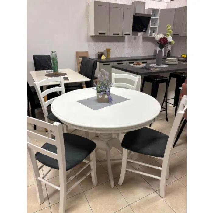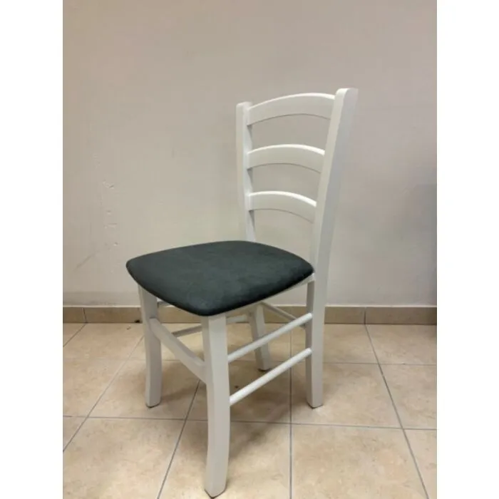 Kuhinjski stol VENEZIA bela je izdelan iz kakovostnega masivnega bukovega lesa, ki zagotavlja stabilnost in trpežnost. Na voljo je v beli barvi lesa. Sedišče je oblazinjeno v sivi barvi, kar omogoča enostavno vzdrževanje ter nudi udobje.