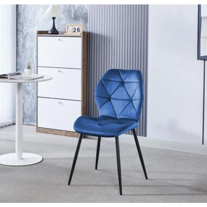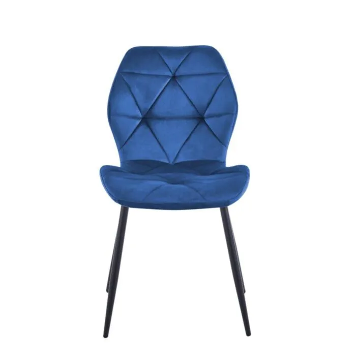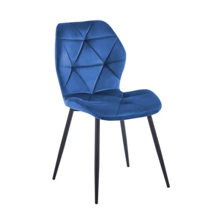 Kuhinjski stol VERACE velvet moder je privlačen in kvaliteten stol za vašo jedilnico s kovinskim črnim podnožjem. Kombinacija modrega prešitega blaga s črnimi kovinskimi nogami ustvari eleganco in lahkotnost. Noge so prašno barvane s debelino profila 1,2 mm. Profiliran naslon omogoča optimalen položaj sedenja ter udobje. Prešiti vzorec pa okrepi tkanino oblazinjenja in ustvari dodatno eleganco.