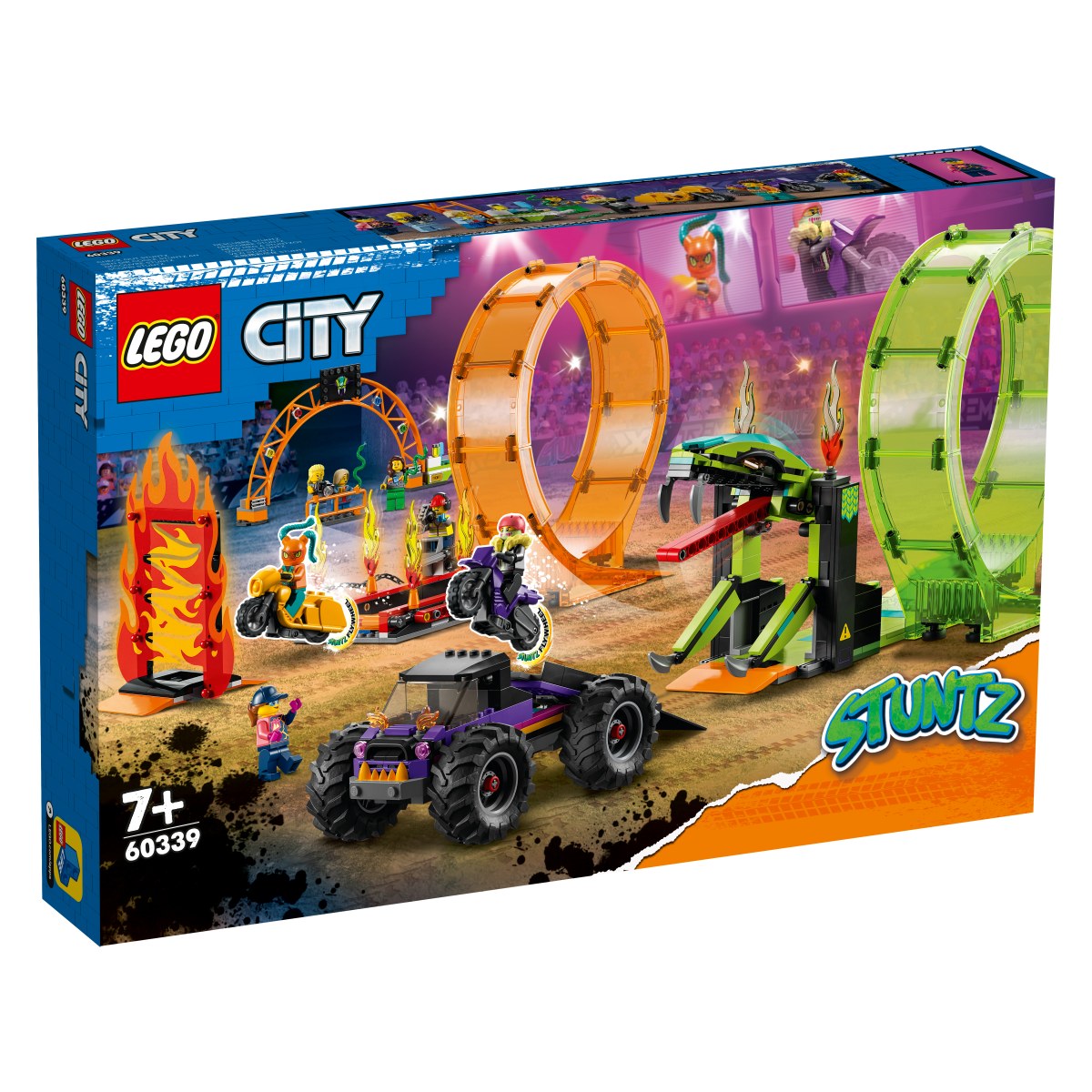 Odpravi se do arene z dvojno kaskadersko zanko, kjer se pripravlja spektakularna kaskaderska predstava! Navij svoj motor z vztrajnikom in se zapodi po odskočni rampi s tako hitrostjo, da boš brez najmanjših težav preskočil pošastni tovornjak in se prebil skozi ognjeni zid! Zapodi se po zanki in pobegni šklepetajočim kačjim čeljustim s kulsko vožnjo po zadnjem kolesu! Nato se iztrgaj gravitaciji s popolnim odskokom, ki bo vžgal ognjeno zanko. Akcije Stuntz vedno navdušijo občinstvo v LEGO® Cityju!
