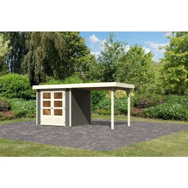 Vrtna hiška Askola 2 – poudarek na vašem vrtu. Sistemska hiša 19mm iz nordijske smreke v enostavnem vtičnem in vijačnem sistemu je na voljo v barvah terra grey, antracit in natural.