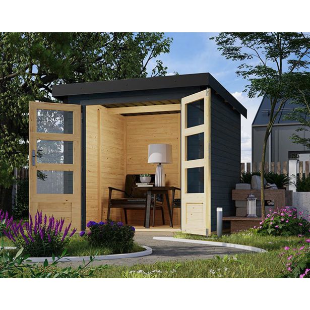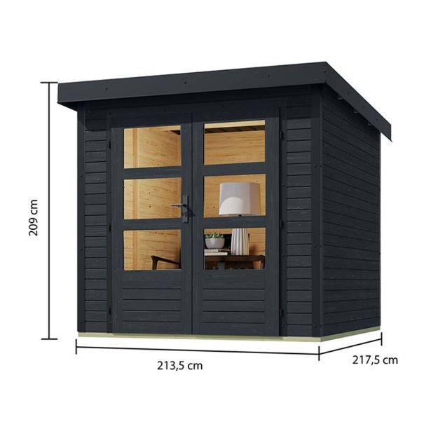 Osnovna zasnova Jupitra temelji na ravnih linijah in minimalistični eleganci in je zato povsem v skladu z duhom časa. Raznolike barvne kombinacije vam nudijo najvišjo stopnjo individualnosti. Kombinirajte različne barve lesenih elementov, kot so naravna, terra siva, vodno siva in antracit z belimi, sivimi ali antracit kovinskimi elementi. Z dodatno 2,4-metrsko podaljšano streho lahko ustvarite več prostora za shranjevanje naprav ali prijeten vrtni bivalni prostor.