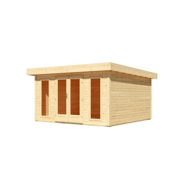 Karibu vrtna hiša Lotus z zelenim strešnim kompletom v naravni izvedbi v 38 mm vtičnem/vijačnem sistemu, vključno z modernimi zelo visokimi dvokrilnimi vrati s cilindrično ključavnico, streho iz masivnega lesa in okovjem.