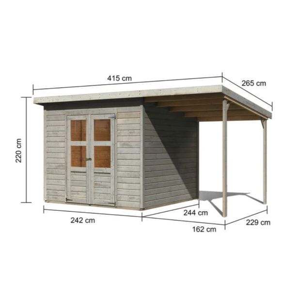 Praktična podaljšana streha nudi dodaten prostor za shranjevanje žarov, koles, itd. Ta nadstrešek lahko pritrdite na desno ali levo stran vrtne hišice.