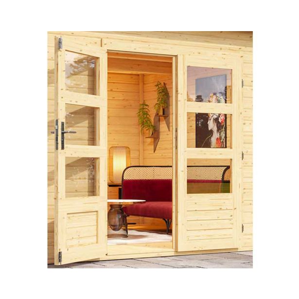 Štirje stekleni izrezi za svetlobo na dvokrilnih vratih in tisti na enokrilnih vratih zagotavljajo dovolj dnevne svetlobe v vaši novi vrtni hišici. Vaša vrtna hiška je varno zaklenjena s cilindrično ključavnico in tremi pripadajočimi ključi na vrata. Naj bo lesena vrtna hiša Karibu Schönbuch 1 vaša nova vrtna hiša še danes!
