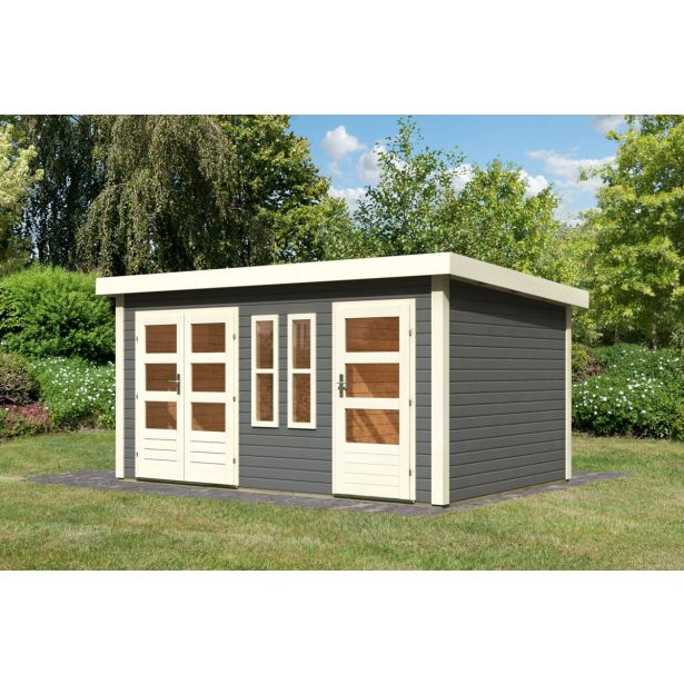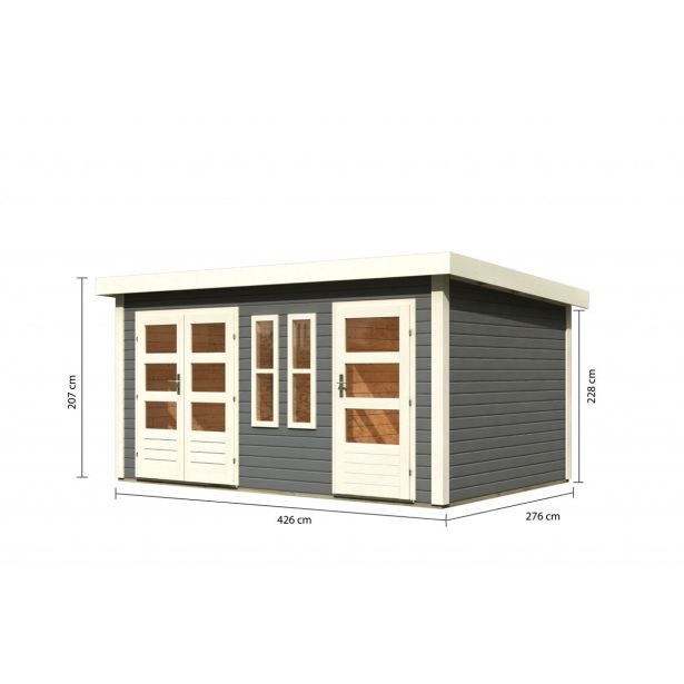 Š 426 x G 276 x V 228 cm, Karibu 38 mm dvosobna vrtna hišica Schönbuch 2 v naravni ali terra sivi barvi, vključno z 28 mm srednjo steno, dvokrilnimi vrati, enokrilnimi vrati, 19 mm ravno streho iz masivnega lesa . 2 okni popravljeni.