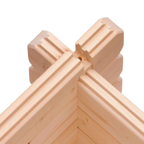Patentirana vogalna povezava 6-Plus naredi konstrukcijo hiše iz hlodov s stabilno 38 mm debelino stene robustno in vzdržljivo. Pri tem načinu gradnje so stenske deske zložene v vrsto, začenši s polovico deske za gladko in stabilno oporo, nato pa privijačene skupaj. Karibus patentirana kotna povezava 6-Plus zagotavlja zelo visoko odpornost proti dežju in vetru. Zaradi dvojnega pera in utora so stene izjemno stabilne. Predizvrtane luknje v kotnih spojih za vijačenje debel so tovarniško izdelane in izjemno skrajšajo čas montaže . Ekapna streha je iz masivnega lesa. Sprednji strešni previs učinkovito ščiti tudi vhodni prostor . Tlačno impregnirani nosilci ščitijo od spodaj in so že zaščiteni pred vremenskimi vplivi in lesno razkrojnimi glivami.