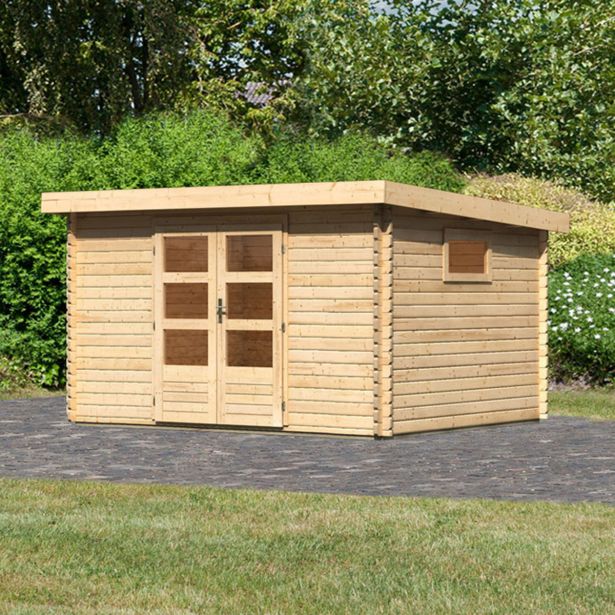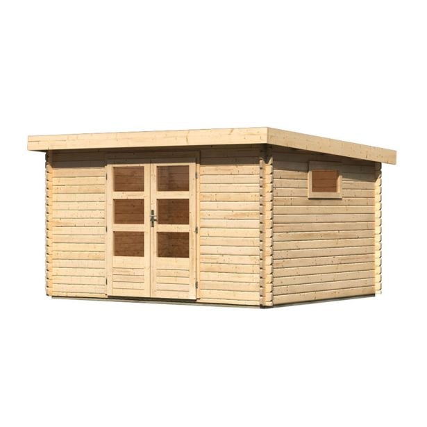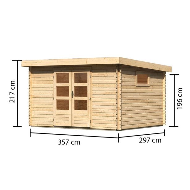 Karibu Trittau 4, brunarice iz nordijske smreke 38 mm, pero in utor z vogalno povezavo 6-Plus, dvokrilna streha iz masivnih lesenih desk, dvokrilna vrata z varovano ključavnico in 2 ključema, fiksno okno z umetnim steklom.
