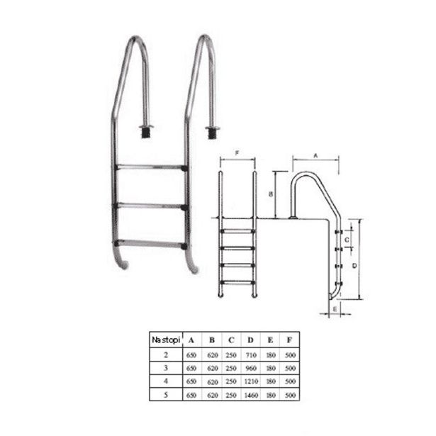 Lestev je na zgornjem delu široka in je zato še posebej primerna za bazene z bazensko obrobo. Material: 2VA, nerjaveče jeklo fi 43 mm. Priložen pritrdilni material. Montaža lestve ni vključena v ceno.