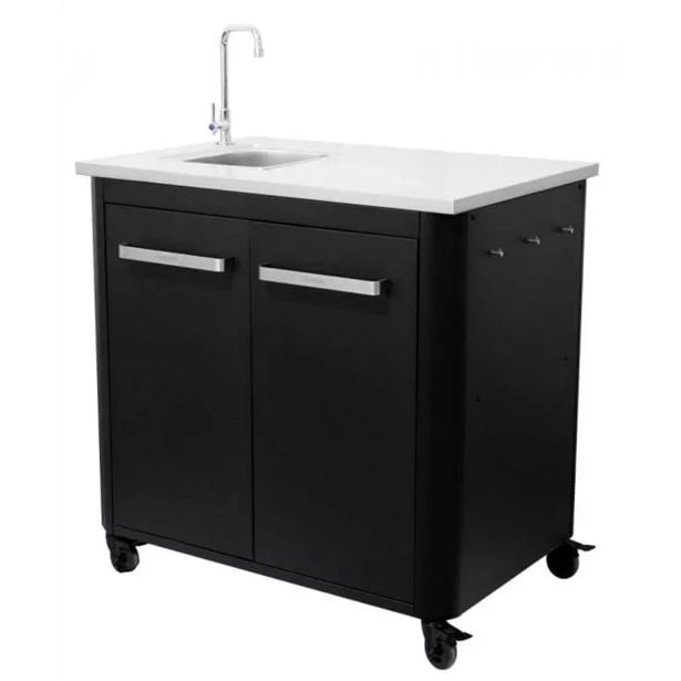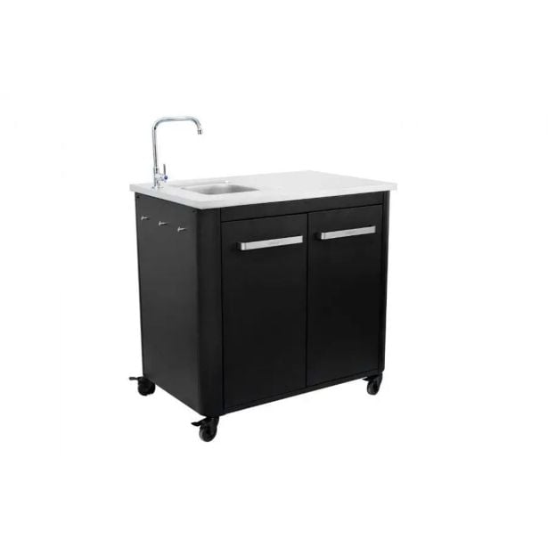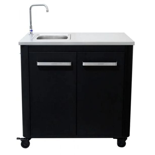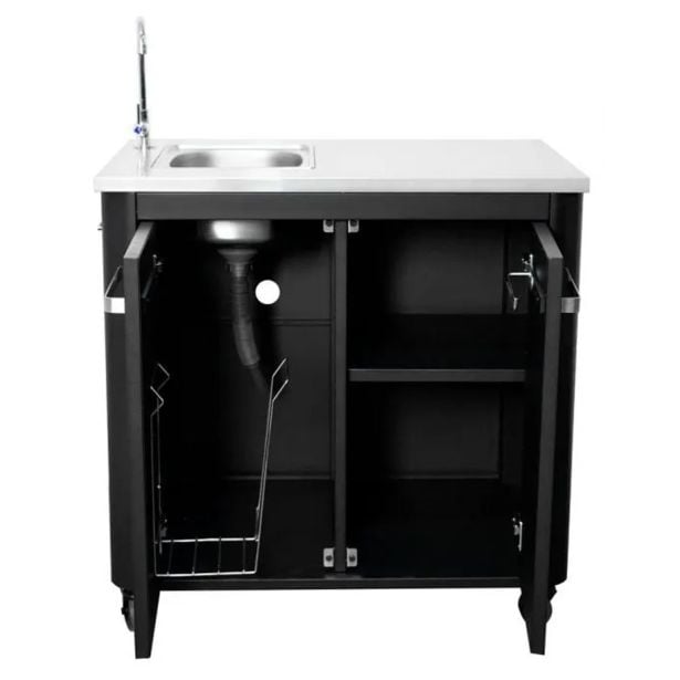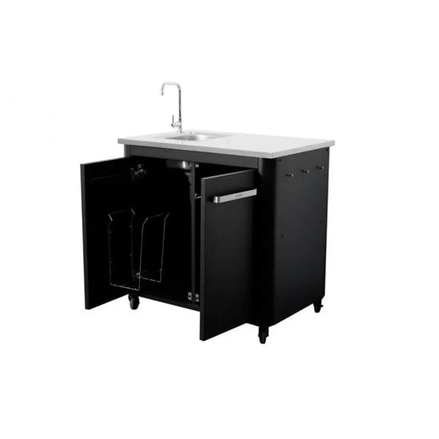 Miza za zunanjo kuhinjo s stabilno površino za odlaganje, prostorom za plinsko jeklenko, polico za odlaganje pripomočkov, koritom in armaturo.