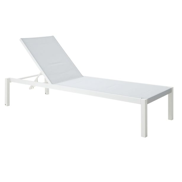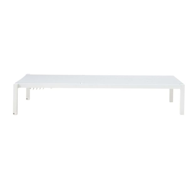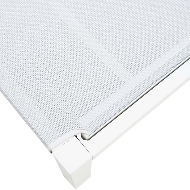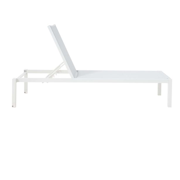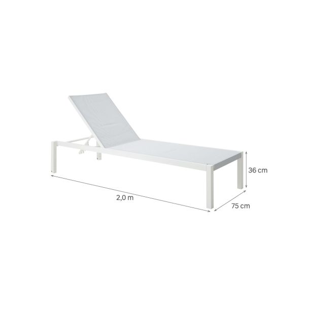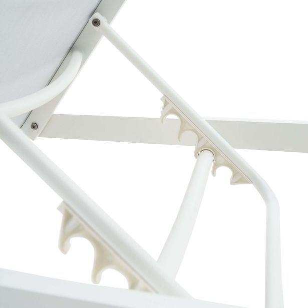 Ležalnik – aluminijast okvir, prašno premazan, 2×2 tekstilen, brez blazine, okovje iz nerjavnega jekla 304. Bela barva, z likanim tekstilenom, z nevidnimi kolesi, z nastavljivim naslonjalom v 4 položaje. Karton.