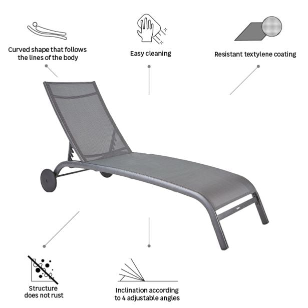 Ležalnik Lyra II je zasnovan za trajno udobje. Njegova oblazinjena prevleka iz tekstilena je fleksibilna in sledi krivuljam vašega telesa. Ta trpežna tkanina iz pletenega PVC-ja je odporna proti vlagi in omogoča prehod zraka in vode, kar zagotavlja dolgo življenjsko dobo. Nastavljivo naslonjalo ponuja štiri različne položaje, ki se prilagajajo vašim željam ? uživajte v dremanju na soncu ali pa v osvežilni pijači v polsedečem položaju.