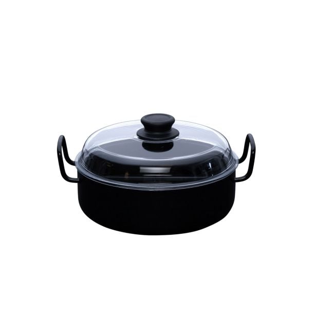 Črna kozica Oma s steklenim pokrovom, 24cm. Okrogla emajlirana posoda z visokim robom je prava vsestranska posoda. Z dvema pratkičnima ročajema jo lahko postavite tudi neposredno na jedilno mizo kot servirno ponev.