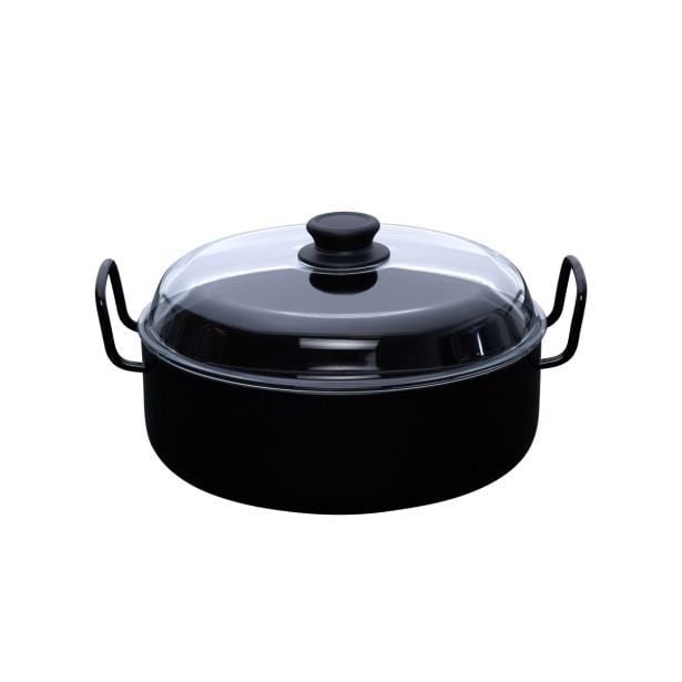 Črna kozica Oma s steklenim pokrovom, 28cm. Okrogla emajlirana posoda z visokim robom je prava vsestranska posoda. Z dvema pratkičnima ročajema jo lahko postavite tudi neposredno na jedilno mizo kot servirno ponev.