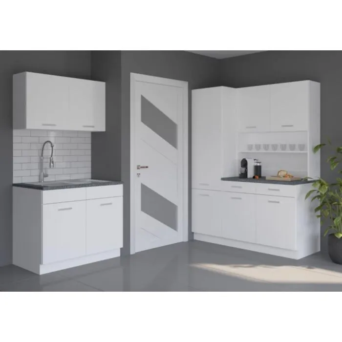 Mini kuhinjski blok RUBI 100 je primeren za vsako pisarno in delavnico. Zaradi svoje velikosti vam bo prihranil veliko prostora, hkrati pa vas bo navdušila zaradi svoje uporabnosti. Mini kuhinja je izdelana iz oplemenitenih ivernih plošč debeline 16 mm in je oblečena v dekor, kateri jo ščiti pred vlago. Blok je dostopen v več različnih barvah. V ceno je vključen takšen sestav, kot je viden na sliki. Globina spodnje omarice je 48,5 cm.