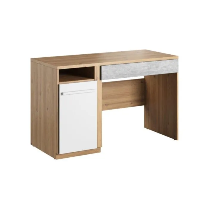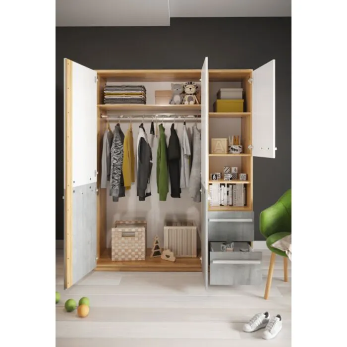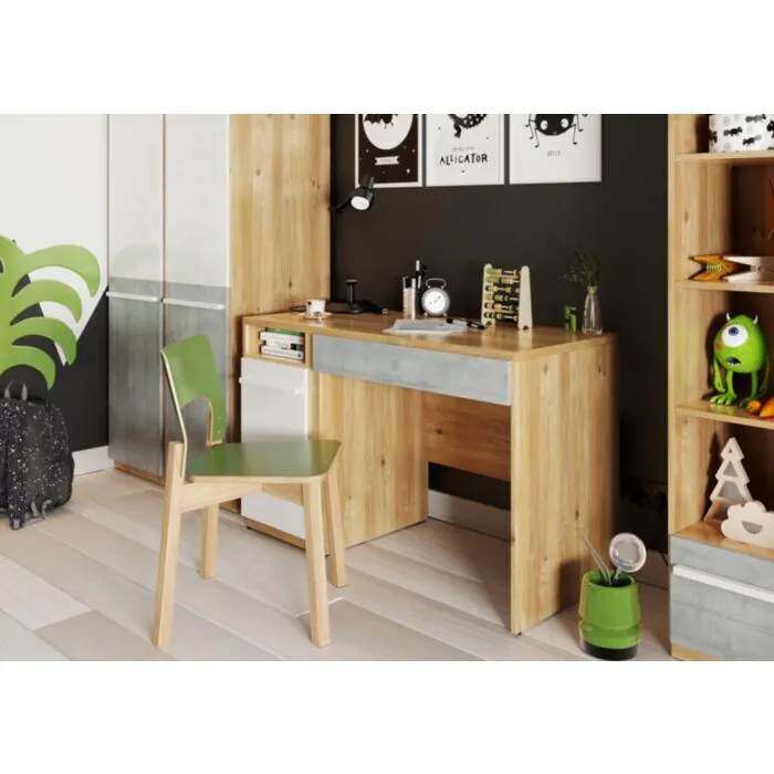 Mladinska soba KLAVIR je narejena iz kvalitetne laminirane plošče. Zaradi univerzalne barvne kombinacije, ki uporablja lepoto bele in lesenega dekorja, je primerna za otroke vseh starosti, tako fantkov kot deklic. V ceni je vključeno: 1 x garderobna omara (Dvovratna omara s šankom je odlična rešitev za vse, ki imate radi oblačila prosto viseča na obešalnikih. Dno omare lahko uspešno uporabite za shranjevanje škatel za čevlje, kovčkov ali manjše športne opreme), 1 x knjižni regal (Knjižna omara je opremljena s širokim, prostornim predalom, v katerega lahko priročno shranite npr. dokumente ali manjše predmete. Vitek korpus, police v barvi lesa v kombinaciji s sivim predalom poskrbijo, da je knjižna omara moderna in se enostavno prilagaja različnim stilom), 1 x komoda (Izjemno funkcionalna komoda z dvema lahko dostopnima predaloma, omarico in dvema vdolbinama bo poskrbela, da boste zlahka shranili karkoli želite – igrače, šolske pripomočke ali najbolj skrivne zaklade) , 1 x pisalna miza (Modna in udobna pisalna miza z vrati, predalom pod ploščo in priročno nišo. Ergonomsko oblikovana mizna plošča zagotavlja udobno delo in učenje. Velika omara omogoča shranjevanje zvezkov, knjig in drugih šolskih potrebščin. Priročen predal, nameščen pod mizo, je dobro mesto za skrivanje šolskih drobnarij), 1 x nočna omarica (Nočna omarica z nišo in predalom bo uporabna v vsakem prostoru za sprostitev. Vanj lahko pospravite vse potrebne drobnarije, ki jih imate najraje blizu tudi med spanjem. Odlična je tudi kot namizna plošča za bralno lučko in za odložitev telefona ali zvečer prebrano knjigo) ter 1 x postelja (Modna in elegantna postelja, kjer se lahko udobno spočijete in spite po dnevu, polnem aktivnosti. Pod posteljo sta dva prostorna predala za posteljnino, odeje ali druge stvari. Visok vzglavnik zagotavlja udobno oporo med večernim branjem ali gledanjem vašega najljubšega filma).