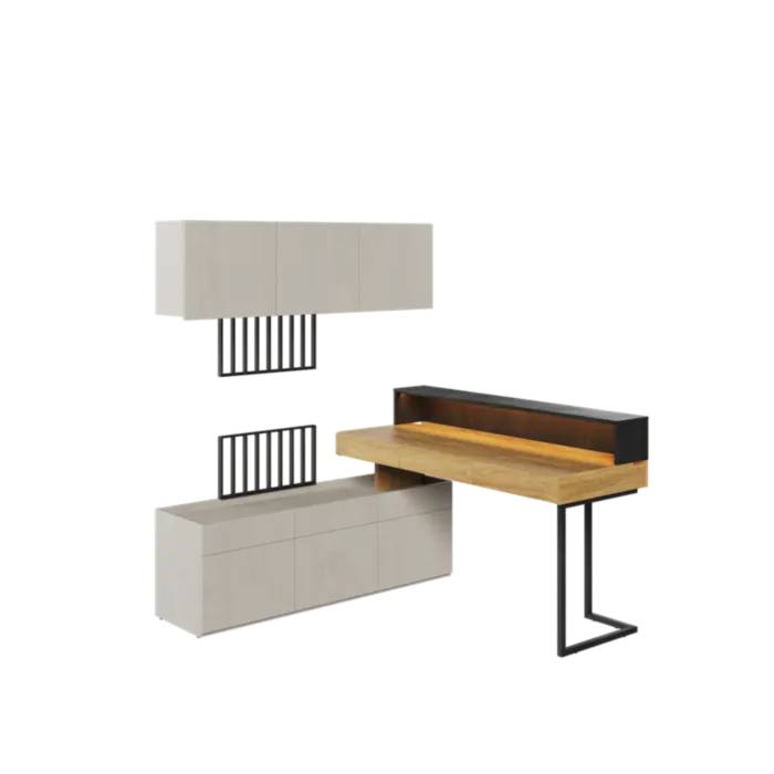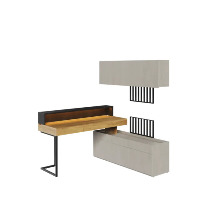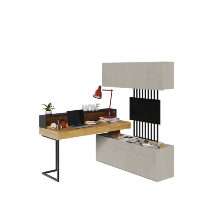 Mladinska soba SIMPL 3 je odlična ponudba za tiste, ki želijo sobo urediti v dizajnerskem in brezčasnem stilu. Komplet je sestavljen iz sedmih elementov: 1 x pisalna miza (Šolska miza v mladinski sobi je element, ki ga pri urejanju prijaznega učnega prostora ne gre izpustiti. Mladinska pisalna miza s predali iz kolekcije SIMPL ima delovno ploščo ergonomske velikosti. Pohištvo je naslonjeno na vitke noge, ki mu dajejo lahkotnost), 1 x namizni podaljšek z LED (Popoln za prikaz monitorja, dodatne svetilke ali vaših najljubših okraskov na vrhu. Opremljen je z modno LED osvetlitvijo energične barve, ki poudarja sodoben značaj pohištva) , 1 x komplet 3 omaric (Moderna omara za mladinsko sobo s tremi vrati. V notranjosti skriva funkcionalno razporeditev polic, ki bo poskrbela za lažji red. Kos pohištva je opremljen s spuščenim zgornjim delom, zahvaljujoč kateremu so izpostavljene stvari na njegovi površini zaščitene pred padci. Uspešno jo lahko uredimo na primer kot TV omaro), 1 x komplet 3 visečih omaric (Modna viseča omarica za mladinsko sobo s tremi vrati vam omogoča, da stenski prostor izkoristite za shranjevanje na zanimiv način. Odlično se bo obnesel, če bo visel nad drugim pohištvom iz kolekcije, na primer nad pisalno mizo. Notranjost nudi praktično razporeditev polic, ki olajšajo urejenost knjig, iger ali drugih šolskih potrebščin. Dodatne prednosti, ki bloku dajejo minimalističen slog, so fronte brez ročajev. Omarica na steno je odlična rešitev za majhne prostore, kjer želimo čim bolj prihraniti prostor) ter 1 x TV panel (Dizajnerska in izjemno modna TV plošča v obliki lamel z vgrajeno LED osvetlitvijo energijsko oranžne barve. Izgleda odlično v kombinaciji z drugimi izdelki).