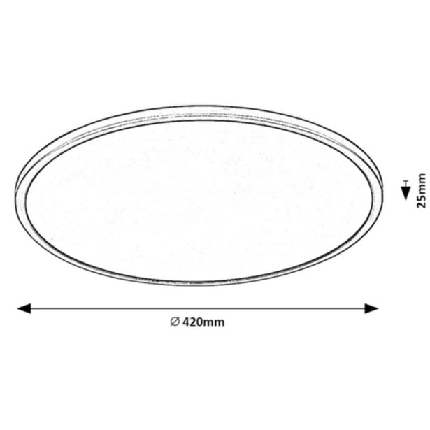 Svetilo deluje pri napetosti 230V in frekvenci 50Hz ter ima IP20 zaščito, kar pomeni, da je primerno za notranjo uporabo. Premer svetila znaša 420 mm, oddaljenost od stropa pa 25 cm, kar omogoča enostavno namestitev in prilagoditev v različnih prostorih.