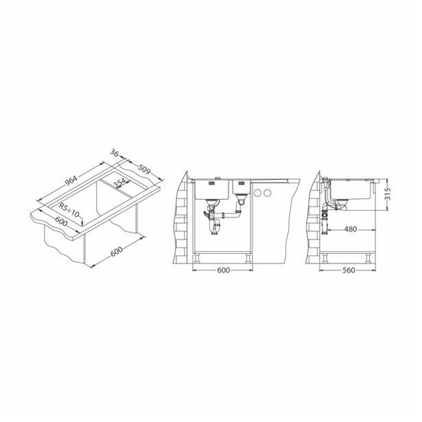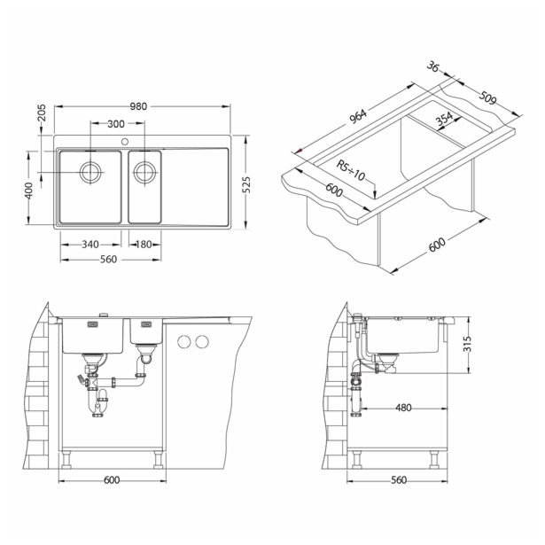 NERJAVNO POMIVALNO KORITO ALVEUS PURE 60, DESNI, SATIN 980X525 MM