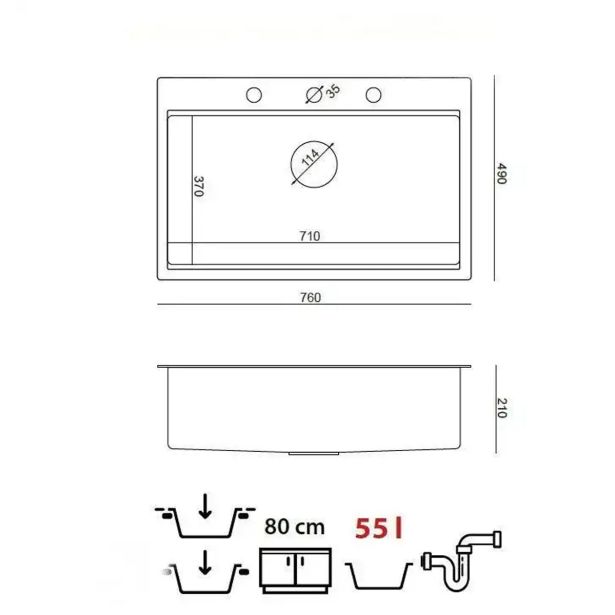 Enojno korito, dimenzij 76 x 50 x 23,5 cm.Pomivalnemu koritu BURT WORKSTATION so priloženi dodatki deska za rezanje, jekleno cedilo, odcejevalnik,dozirnik mila in sifon. Dodatki poskrbijo za popolno funkcionalnost korita.