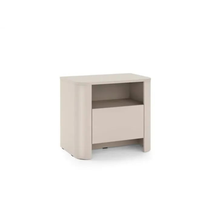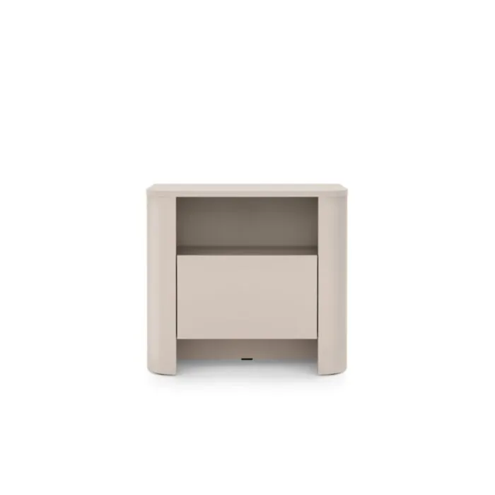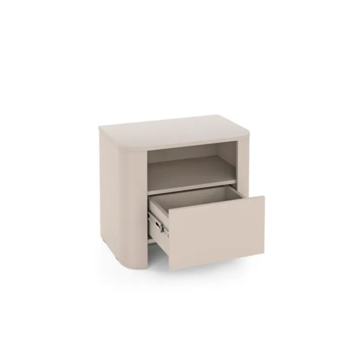 Estetsko se poda v vsak prostor ter ima dobro odpornost na madeže in vlago. Ima ABS robove, ki zagotavljajo večjo odpornost proti udarcem, vlagi in obrabi ter podaljšujejo njeno življenjsko dobo. ABS robovi ne le ščitijo pred poškodbami, ampak poskrbijo tudi za lepši in elegantnejši videz pohištva. Dodatna prednost nočne omarice je njena prostornost, vanjo lahko spravite veliko stvari in s tem poskrbiste za dodatno organizacijo in urejenost. Ima sistem odpiranja “PUSH TO OPEN”, kar zagotavlja enostavno odpiranje in zapiranje omarice, brez da bi imela nepotrebne ročaje.