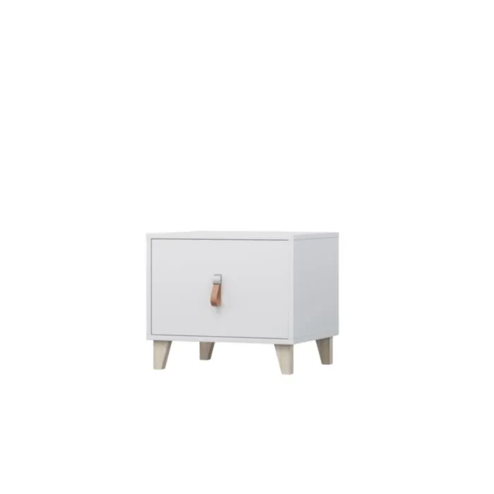 Nočna omarica LOVY je primerna za vse otroške in mladinske sobe. Dobavljiva je v beli barvi, ročaj pa je iz naravnega usnja. Narejena je iz laminirane plošče debeline 16 mm z ABS robovi. Noge so lesene.