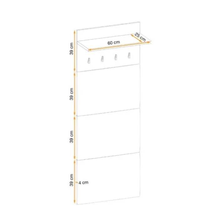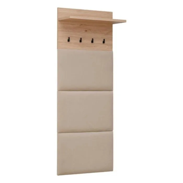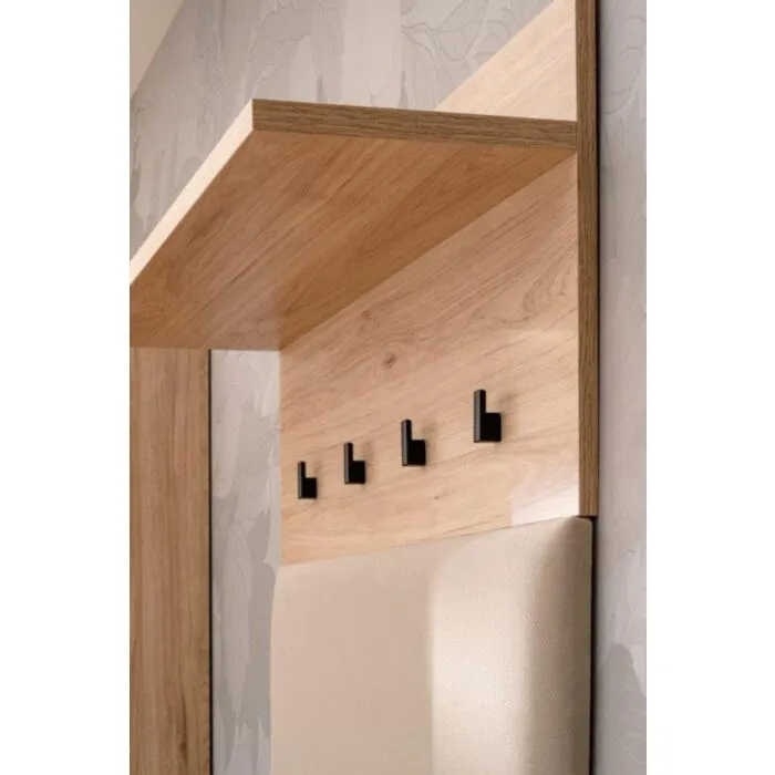 Obešalnik za predsobo BERI je eleganten ter atraktiven. Obešalna stena je oblazinjena v velvet bež blagu. Moderen dizajn v barvi svetlega hrasta, v kombinaciji črnih obešalnih kljukic. Obešalna stena je praktična za uporabo, saj vsebuje zgorja tudi poličko.