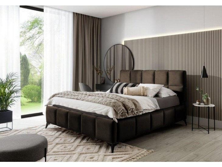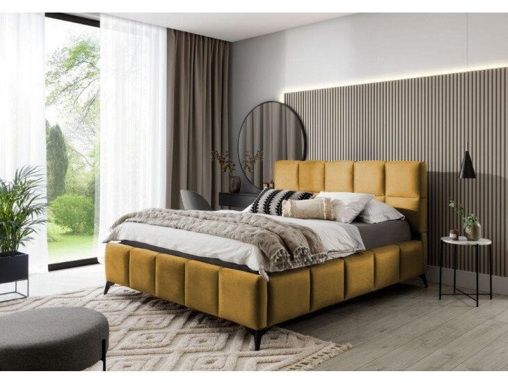 Prešit material krasi posteljo, dodaja stil ter značaj in prinaša pridih modernosti. Črne kovinske noge dolžine 14 centimetrov poskrbijo, da postelja navidezno lebdi nad tlemi, kar dodatno optično poveča prostor v katerem bo postelja ANGELINA . Poleg tega je postelja opremljena tudi s posodo za posteljnino, ki je zelo dobra rešitev za majhne prostore in vam omogoča, da poskrbite za red v spalnici.