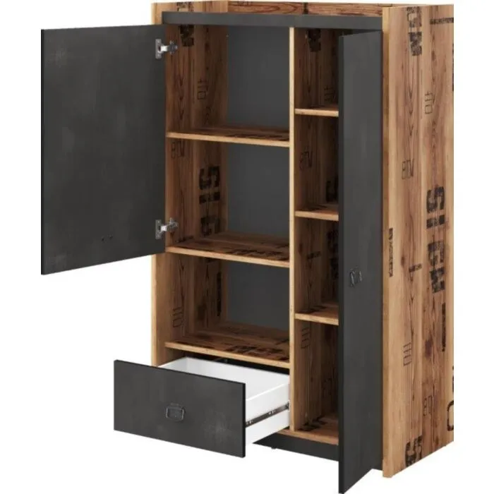 Omara FERDO je primerna za vsak prostor. Lahko se jo uporablja kot omaro v dnevni sobi ali pa kot garderobno omaro. Ima en predal, 5 polic ter dvojna vrata.