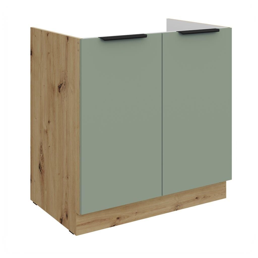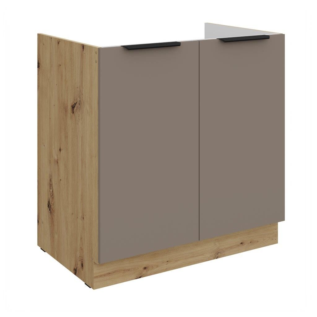 Omara za pomivalno korito ARIANA hrast 80D je sestavljena iz laminirane plošče, debeline 16 mm, robovi so zaščiteni z ABS robom 1 mm, ročaji pa so iz kovine v črni barvi. Korpus je narejen iz laminirane plošče, debeline 16 mm, robovi so iz melamina. Kuhinjski element je na voljo v več barvnih kombinacijah in je opremljen z mehkim zapiranjem.