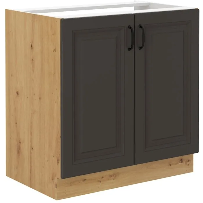 Omara za pomivalno korito PRESTIGE 80D je sestavljena iz dveh front iz MDF plošče, debeline 16 mm, robovi so iz ABS 1 mm, ročaji pa so iz kovine v črni barvi. Korpus je narejen iz laminirane plošče, debeline 16 mm, robovi so iz melamina. Kuhinjski element je na voljo v barvi grafit/hrast in ima mehko zapiranje.