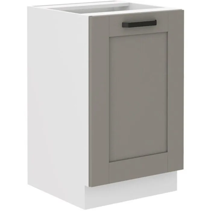 Omara za pomivalno korito TAJA 50D je sestavljena iz MDF plošče, debeline 16 mm, robovi so iz ABS 1 mm, ročaji pa so iz kovine v črni barvi. Korpus je narejen iz laminirane plošče, debeline 16 mm, robovi so iz melamina. Kuhinjski element je na voljo v barvi bela/taupe in ima mehko zapiranje.