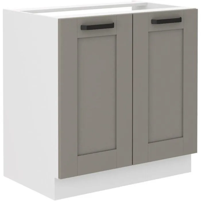 Omara za pomivalno korito TAJA 80D je sestavljena iz MDF plošče, debeline 16 mm, robovi so iz ABS 1 mm, ročaji pa so iz kovine v črni barvi. Korpus je narejen iz laminirane plošče, debeline 16 mm, robovi so iz melamina. Kuhinjski element je na voljo v barvi bela/taupe in ima mehko zapiranje.