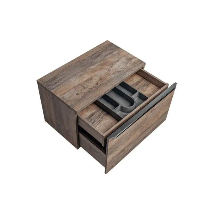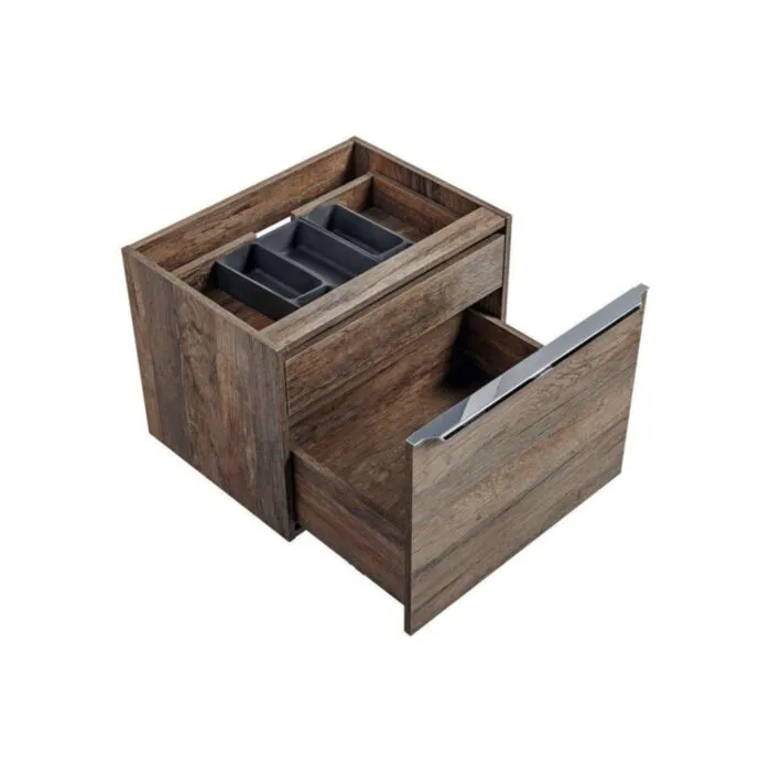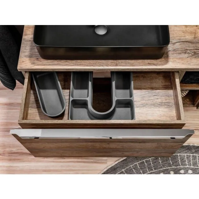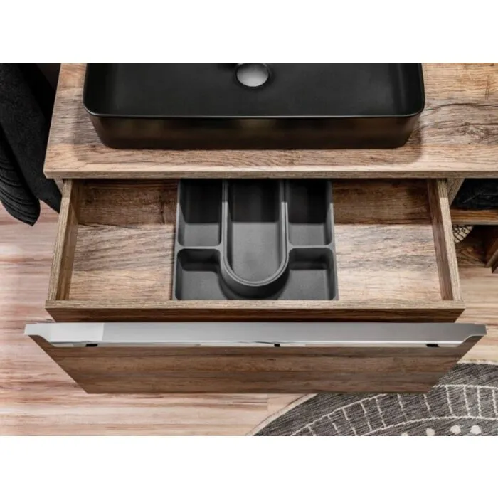 Omarica za umivalnik KELLY 80 je narejena iz kvalitetnih materialov. Stare sprednje strani in ohišje v barvi hrasta v kombinaciji s kromiranimi ročaji dajejo celotnemu kosu lahkotnost in eleganco. V omarici imate tudi organizator predala, ki vam omogoča preglednost v predalu. Omarica vsebuje mehko zapiranje.