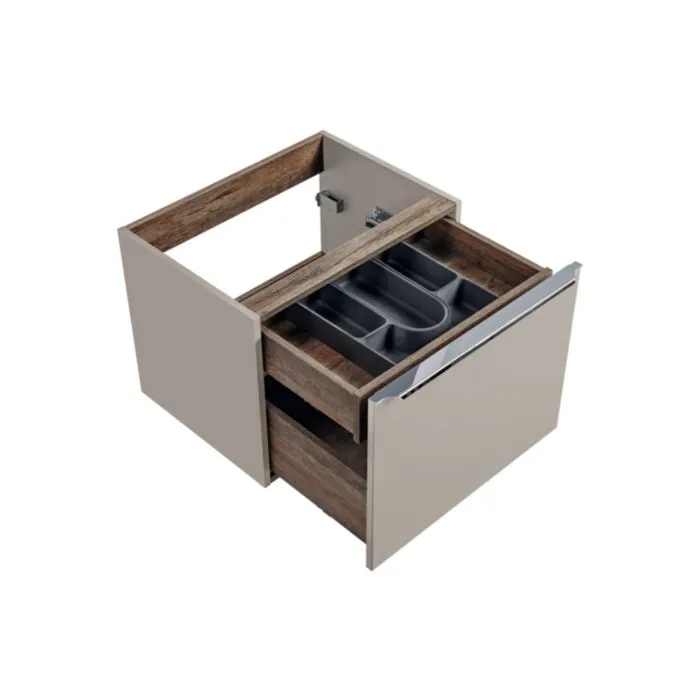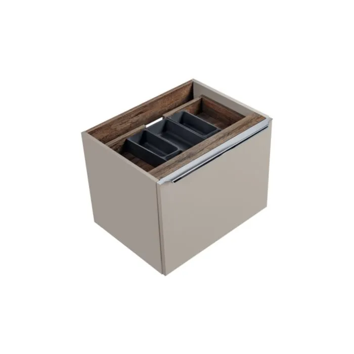 Omarica za umivalnik KROKI 80 je narejena iz kvalitetne laminirane plošče. Taupe barve sprednjih strani in ohišja v kombinaciji s kromiranimi ročaji dajejo celotno lahkotnost in eleganco.Poleg dobite tudi organizator predala. Vsebuje mehko zapiranje.