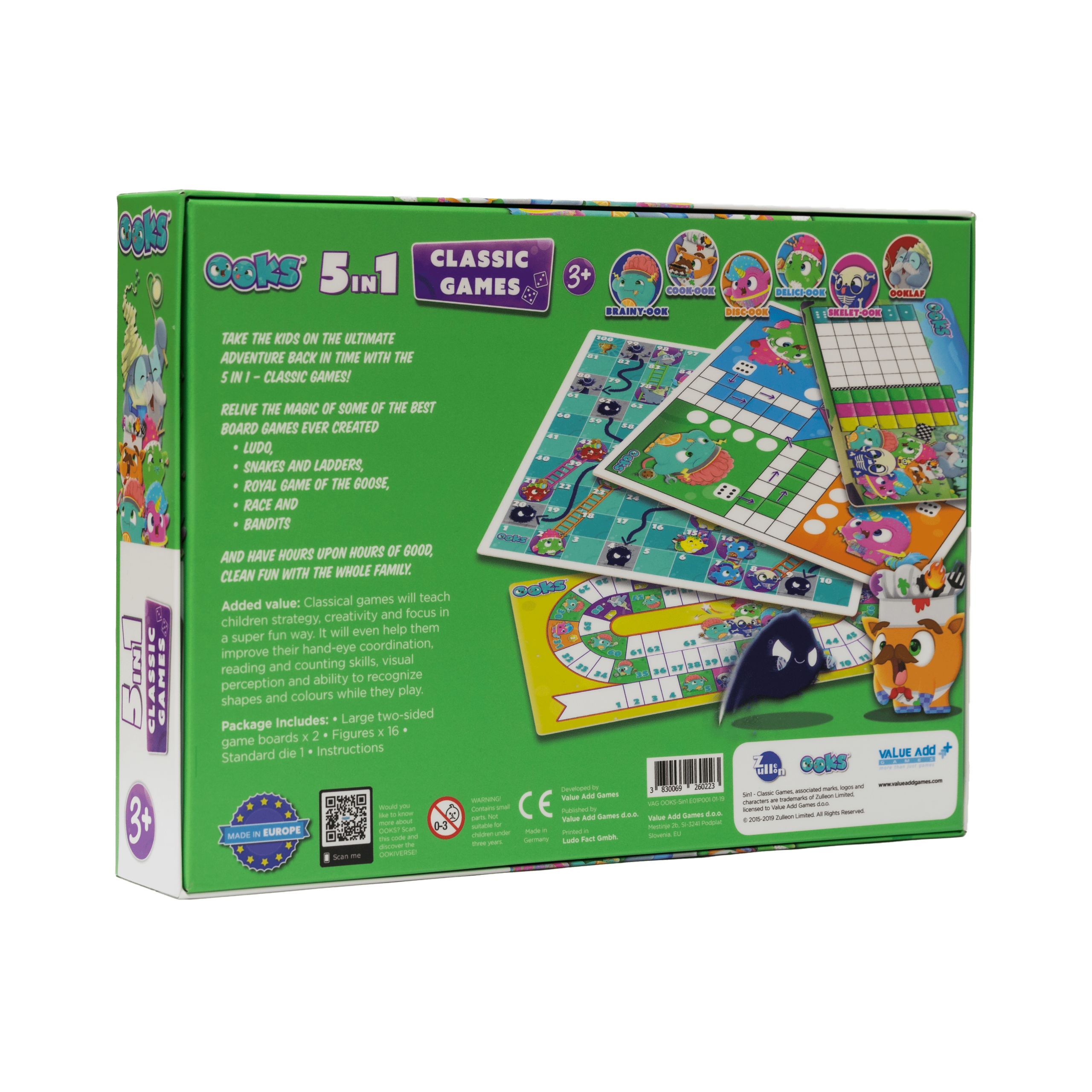 OOKs 5 v 1 je zbirka najboljših otroških iger, ki že stoletja kljubujejo zobu časa – Človek, ne jezi se, Kače in lestve, Kraljevska igra gosi, Dirka in Banditi.