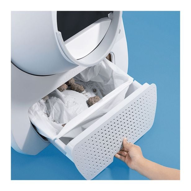 Kapaciteta peska je do 13L, kar zadošča za do 14 dni uporabe ene mačke oziroma približno 7 dni za 2-3 mačke. Tako vam ni več treba vsak dan čistiti koša za smeti in lahko odidete za nekaj dni brez skrbi. Posoda za odpadke se nahaja na sprednji strani enote, zaradi česar je praznjenje veliko lažje. Samo vzemite ven predal, zavrzite staro vrečko za smeti in nato vstavite novo.
