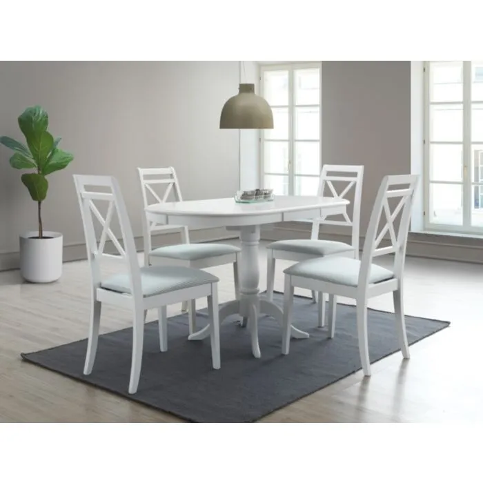Ovalna jedilna miza DOLORES bo poživela vsako jedilnico. Miza je kvalitetna in stabilna. Mizna plošča je izdelana iz MDF – ja v beli barvi. Ogrodje je iz lesa v beli barvi.