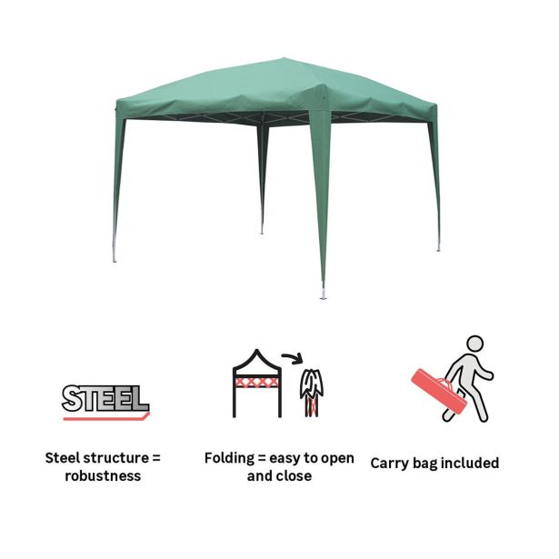 Šotor Eori II Origami je idealen za zaščito vaših gostov pred soncem ali rahlim dežjem med prijetnimi dogodki. S pokrito veliko površino lahko enostavno postavite mizo in stolčke. DIMENZIJE 2,95 x 2,95 metra so vodoodporne in blokirajo 90 % UV žarkov. Njegova jeklena konstrukcija ne rjavi in ??je odporna na slabo vreme.