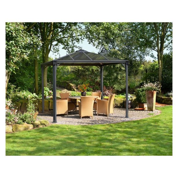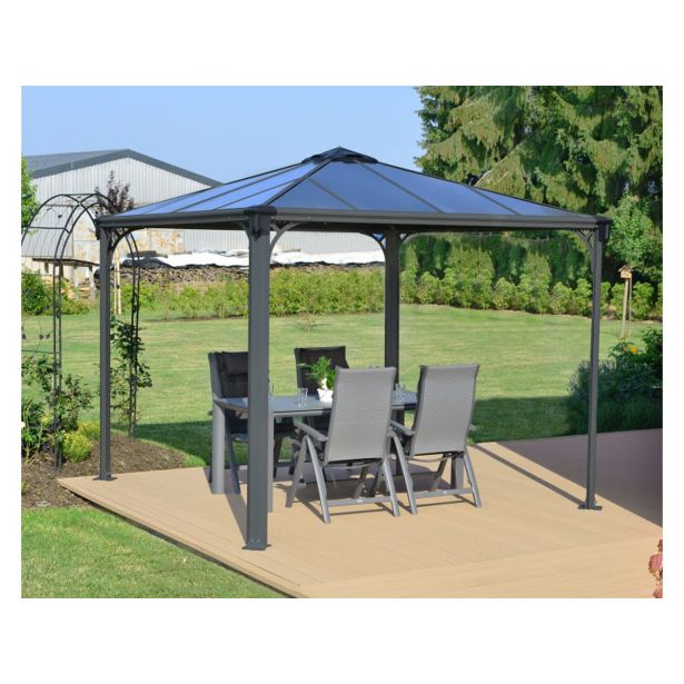 Vtni paviljon Palram Palermo 3000, v sivi / bronz barvi ima eleganten videz. Tukaj boste lahko sedeli zaščiteni, ko bo padal dež ipd.